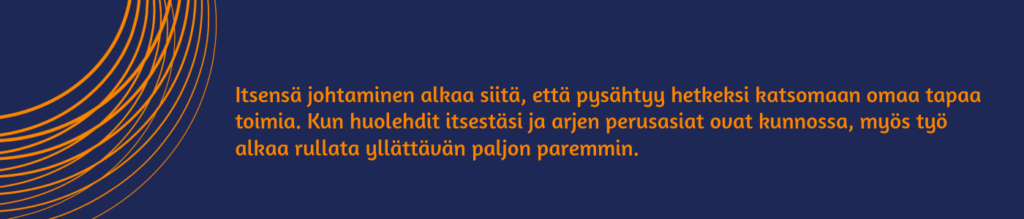 Itsensä johtaminen tarkoittaa oman ajan hallintaa ja keskittymistä olennaiseen. Se alkaa itsensä tuntemisesta – omien vahvuuksien, heikkouksien ja motivaation ymmärtämisestä. Kun tiedät, mikä motivoi sinua ja mikä vie energiaasi, pystyt tekemään parempia valintoja.