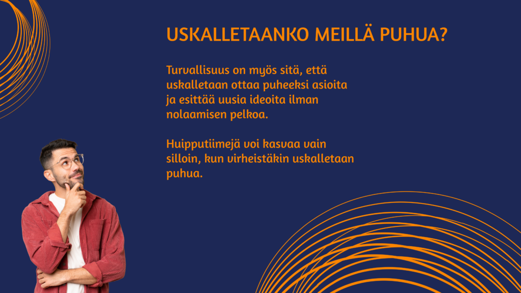 Henkinen turvallisuus puolestaan luo edellytyksiä avoimelle keskustelulle ja luottamukselle työyhteisössä. Se tarkoittaa sitä, että työntekijöillä on mahdollisuus ilmaista mielipiteitään ja huoliaan ilman pelkoa arvostelusta. Turvallinen työilmapiiri, jossa jokaisen mielipide on arvostettu, tukee tuottavuutta ja yhteisöllisyyttä, ja se on keskeinen osa työhyvinvointia. Keskusteleva johtaminen, jossa esihenkilö ja työntekijät käyvät avointa vuoropuhelua, vahvistaa tätä ilmapiiriä.